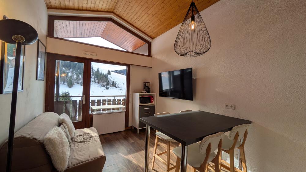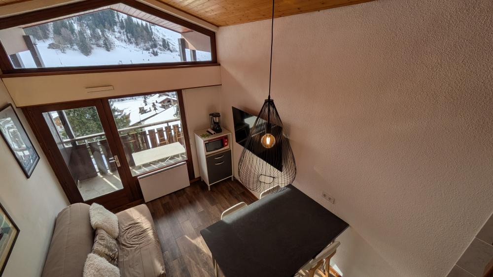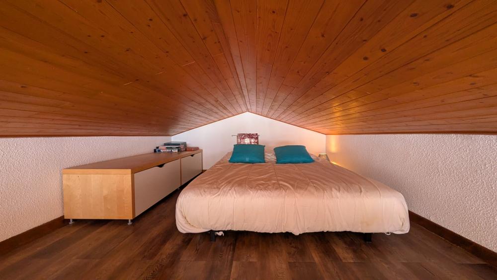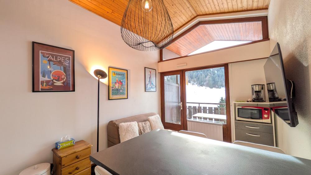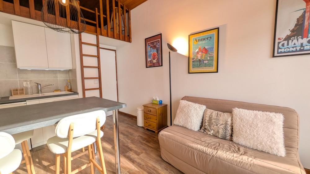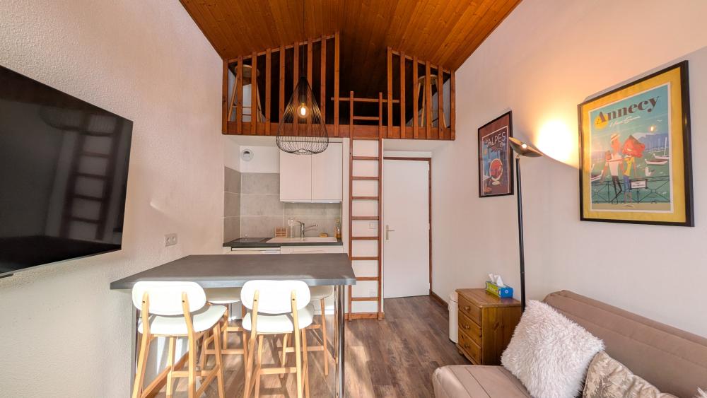 Appartement rénové de type Studio + cabine d'une surface de 21.80 m² environ + mezzanine de 11.98 m². Situé sur les hauteurs du village à 10 min à pied du centre et des commerces et à proximité immédiate d'un arrêt navette. Les + : très lumineux, balcon plein Sud, vue, rénové, cabine fermée + mezzanine, garage, vendu meublé.